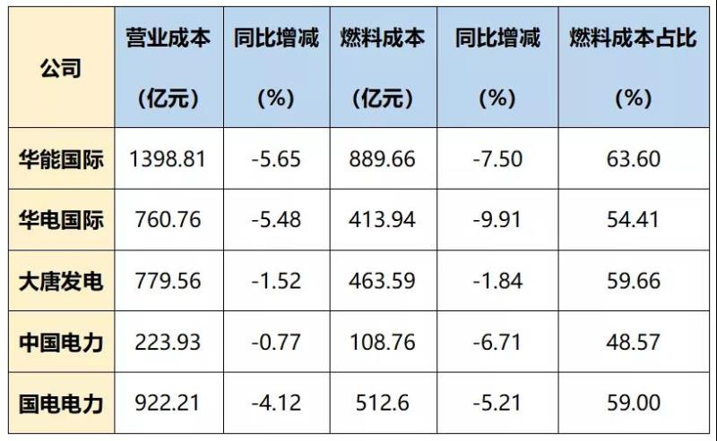 2020年五大發(fā)電央企主要上市公司燃料成本情況