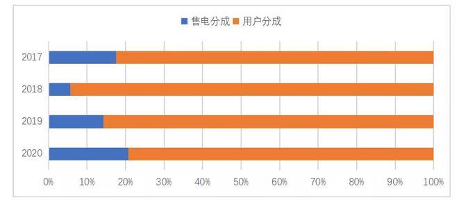 從用戶(hù)側(cè)獲利結(jié)構(gòu)看(圖3),2017年至2020年期間,除2018年售電分成略低(5.7%),其余年份售電分成均在14%以上。其中,2018年至2020年期間,售電分成迅速增加,并在2020年達(dá)到了20.7%,為歷年來(lái)最高??傮w來(lái)看,近年售電公司的分成水平呈現(xiàn)出穩(wěn)中有升的趨勢(shì),售電公司能充分享受到供給側(cè)的讓利。