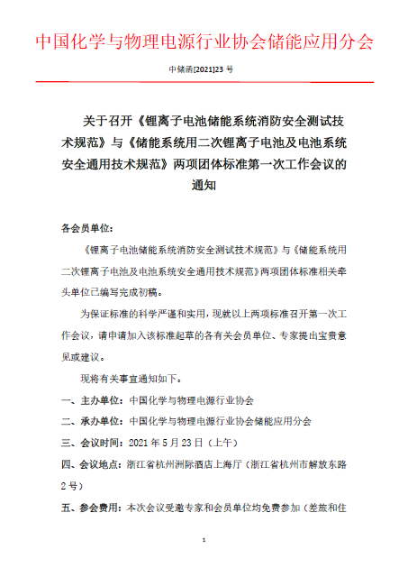關(guān)于召開(kāi)《鋰離子電池儲(chǔ)能系統(tǒng)消防安全測(cè)試技術(shù)規(guī)范》與《儲(chǔ)能系統(tǒng)用二次鋰離子電池及電池系統(tǒng)安全通用技術(shù)規(guī)范》兩項(xiàng)團(tuán)體標(biāo)準(zhǔn)第一次工作會(huì)議的通知