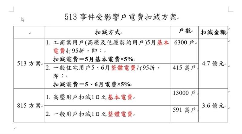 當(dāng)晚18時(shí),臺(tái)灣經(jīng)濟(jì)部門負(fù)責(zé)人王美花召開發(fā)布會(huì),對(duì)該次事故造成的全社會(huì)損失鞠躬道歉,并稱計(jì)劃在21時(shí)40分全部恢復(fù)供電。臺(tái)灣電力公司提供了4.7億元的電費(fèi)扣減方案,其董事長(zhǎng)楊偉甫已自請(qǐng)?zhí)幏帧?
