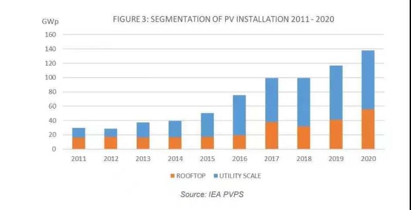 初步數(shù)據(jù)顯示,與2019年相比,2020年公用事業(yè)規(guī)模的光伏市場(chǎng)略有增長(zhǎng),但隨著屋頂市場(chǎng)的增加,其市場(chǎng)份額相對(duì)下降。得益于越南屋頂光伏的爆發(fā),以及澳大利亞、德國(guó)和美國(guó)的部分增長(zhǎng),屋頂光伏容量在2020年實(shí)現(xiàn)了明顯的提升。