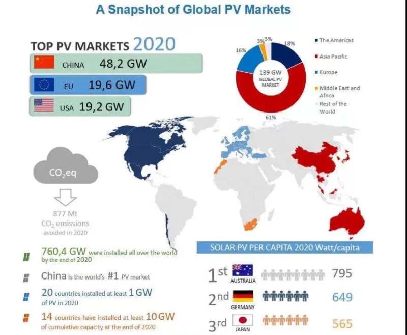 近日,國(guó)際能源署(IEA)發(fā)布了2020年全球光伏報(bào)告,報(bào)告顯示,盡管COVID-19疫情在過(guò)去的一年多全面爆發(fā)和流行,但全球光伏市場(chǎng)再次實(shí)現(xiàn)顯著增長(zhǎng),DC側(cè)裝機(jī)容量為134GW,截止2020年底,全球累計(jì)光伏裝機(jī)760.4GW。有20個(gè)國(guó)家的新增光伏容量超過(guò)了1GW。其中中國(guó)、歐盟和美國(guó)分別以48.2GW、19.6GW和19.2GW的規(guī)模位列全球前三。