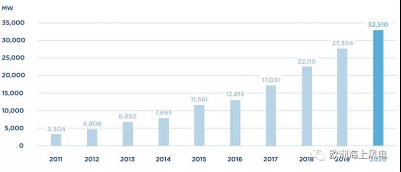 截至2020年底,全球海上風(fēng)電累計(jì)裝機(jī)容量32.5GW,比2018年底的數(shù)字增長(zhǎng)了19.1%。