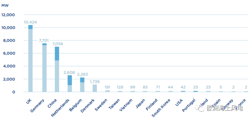 ▲各國(guó)海上風(fēng)電累計(jì)裝機(jī)容量