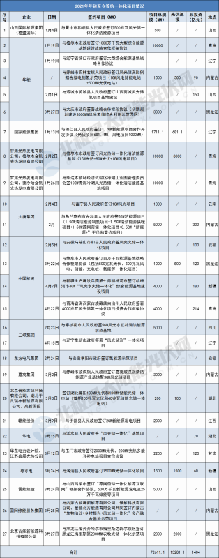 據(jù)北極星太陽能光伏網(wǎng)統(tǒng)計(jì),2021年年初至今,已有16家企業(yè)與地方政府簽訂了27個(gè)光儲(chǔ)、風(fēng)光儲(chǔ)、風(fēng)光水火儲(chǔ)等一體化項(xiàng)目,總規(guī)模超過72.6GW,投資總額1404億元以上。這其中,華能、中國能建、大唐、三峽集團(tuán)等央/國企成為項(xiàng)目投資重要支柱。