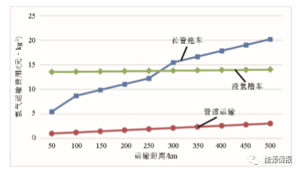 對比長管拖車和液氫槽車兩種運輸方式,運輸距離在250km內(nèi)時,長管拖車運輸費用低于液氫槽車,超過250km后液氫槽車更具經(jīng)濟(jì)優(yōu)勢。