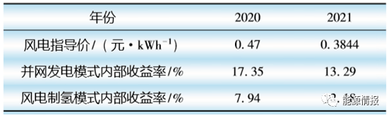 2020年陸上風(fēng)電按指導(dǎo)價0.47元/kWh,風(fēng)電場并網(wǎng)發(fā)電內(nèi)部收益率最高可達(dá)17.35%;2021年起新增集中式陸上風(fēng)電項目全面平價上網(wǎng),以安徽省內(nèi)現(xiàn)行火電標(biāo)桿電價0.3844元/kWh測算,風(fēng)力并網(wǎng)發(fā)電內(nèi)部收益率為13.29%,2020年和2021年并網(wǎng)發(fā)電和制氫兩種模式經(jīng)濟(jì)性對比如表2所示。