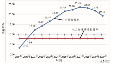 內(nèi)部收益率法是常用的長期投資項目財務(wù)評估的方法之一,內(nèi)部收益率是項目本身期望可達(dá)到的投資收益率,也是其凈現(xiàn)值等于零時的貼現(xiàn)率。若內(nèi)部收益率大于基準(zhǔn)收益率,項目具有可行性;反之,項目財務(wù)不可行。計算風(fēng)電場不同年份選擇進(jìn)入制氫市場下內(nèi)部收益率變化情況如圖3所示(基準(zhǔn)收益率取電力行業(yè)基準(zhǔn)收益率8%)。