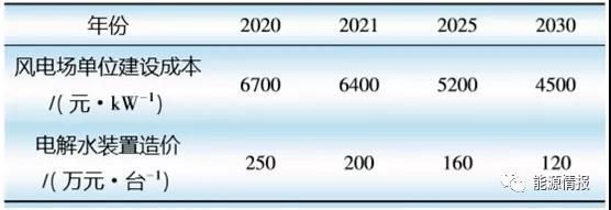 參考金風(fēng)科技統(tǒng)計的風(fēng)電場造價和現(xiàn)有堿性電解水裝置造價數(shù)據(jù),結(jié)合彭博新能源財經(jīng)對堿性電解水裝置造價水平的預(yù)測,風(fēng)電場建設(shè)成本和電解水裝置單位造價變化如表1所示。