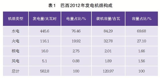 2012年巴西全國發(fā)電總量552.5太瓦時,發(fā)電裝機容量121.0吉瓦,發(fā)電量和總裝機的類型構(gòu)成如表1所示。
