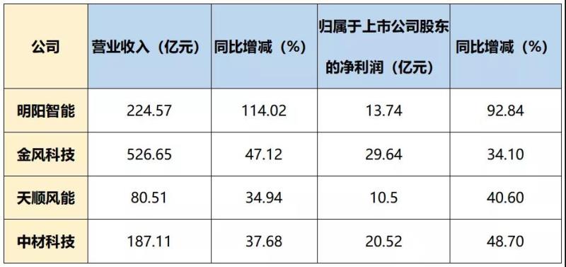 從風(fēng)電主要上市公司業(yè)績表現(xiàn)來看,明陽智能、金風(fēng)科技、天順風(fēng)能、中材科技四家公司的營業(yè)收入和歸母凈利潤同比增加。其中明陽智能營業(yè)收入增幅最大,為114.02%,歸母凈利潤同比增加92.84%。