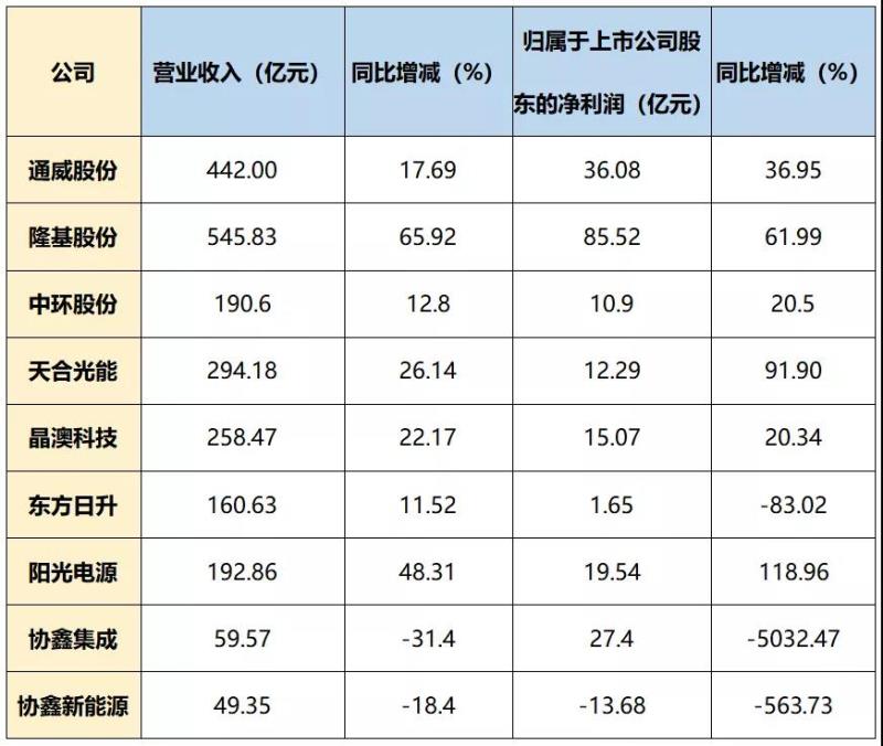 從光伏主要上市公司業(yè)績表現(xiàn)來看,通威股份、隆基股份、中環(huán)科技、天合光能、金澳科技、東方日升、陽光電源營業(yè)收入實(shí)現(xiàn)同比增加。