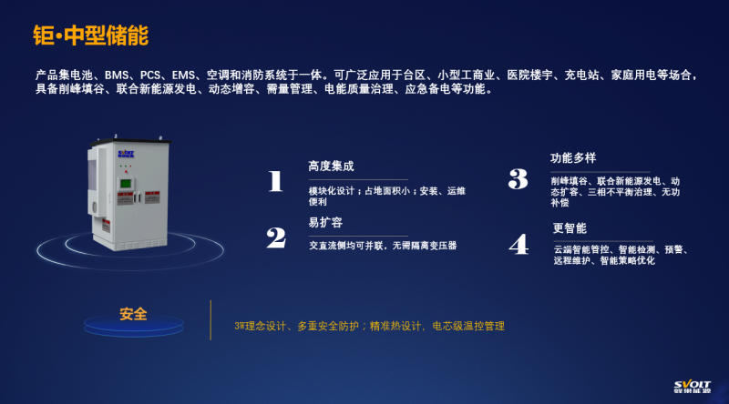 產(chǎn)品集電池、BMS、PCS、EMS、空調(diào)和消防系統(tǒng)于一體??蓮V泛應(yīng)用于臺區(qū)、小型工商業(yè)、醫(yī)院樓宇、充電站、家庭用電等場合,具備削峰填谷、聯(lián)合新能源發(fā)電、動(dòng)態(tài)增容、需量管理、電能質(zhì)量治理、應(yīng)急備電等功能。