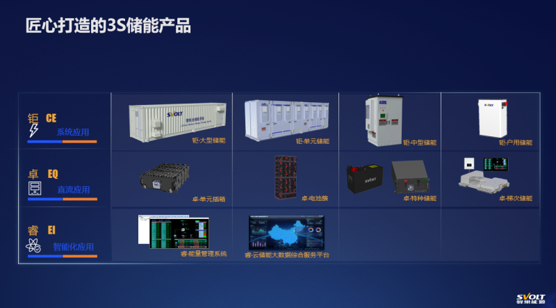 基于3S儲能理念,蜂巢能源推出鉅、卓、睿三大儲能系列產(chǎn)品,包含系統(tǒng)級應(yīng)用的大型、單元、中型、戶用、移動(dòng)儲能;面向直流應(yīng)用的電池簇、基站、房車等特種電源及梯次儲能產(chǎn)品;智能化方面,開發(fā)了面向區(qū)域能源的能量管理系統(tǒng)和云儲能大數(shù)據(jù)綜合服務(wù)平臺。