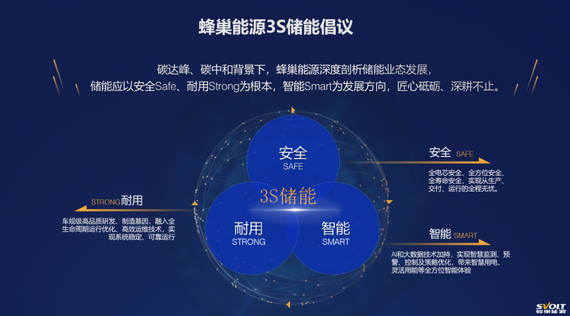 在儲能方面,蜂巢能源系統(tǒng)性思考和剖析能源業(yè)態(tài)發(fā)展,結(jié)合自身車規(guī)級“質(zhì)”造和大數(shù)據(jù)AI發(fā)展優(yōu)勢,為行業(yè)提出了3S儲能發(fā)展理念,儲能應(yīng)以安全Safe、耐用Strong為根本,智能Smart為發(fā)展方向。該理念自提出以來得到了行業(yè)的廣泛好評和認(rèn)可。