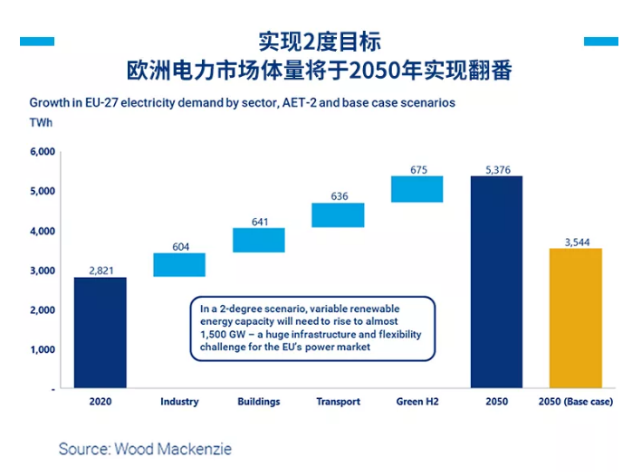 在AET-2場景中,到2050年前的電力需求基本需要翻倍,達到5,376TWh(基本預(yù)測數(shù)據(jù)為3,544TWh),具體如下圖所示。由于電動汽車充電、工業(yè)生產(chǎn)及民用采暖需求加大,大多數(shù)新增需求將由綠色氫能源滿足。