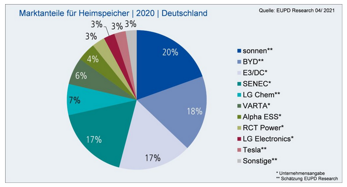 由于對住宅儲能系統(tǒng)的需求不斷增長,這意味著電池儲能供應(yīng)商將會在進一步擴大銷售量。根據(jù)EUPD Research公司在2020年通過對住宅電池儲能制造商、安裝商和最終客戶的廣泛調(diào)查,Sonnen公司和比亞迪公司分別是行業(yè)領(lǐng)先的電池供應(yīng)商,其市場份額分別為20%和18%。E3/DC和Senec排名第三,分別占17%??傮w而言,行業(yè)領(lǐng)先的制造商提供了所有部署的太陽能+電池儲能系統(tǒng)的72%。