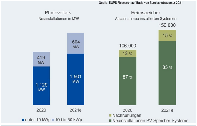 根據(jù)EUPD Research公司的預(yù)計,這一增長趨勢將在今年進一步持續(xù),而今年將部署的裝機容量為10kW以下住宅太陽能發(fā)電設(shè)施的總裝機容量為1.5GW。根據(jù)調(diào)查,德國2020年部署的住宅電池儲能系統(tǒng)總裝機容量達到創(chuàng)紀(jì)錄的1.1GW。分析師預(yù)測,今年部署的裝機容量為10kW到至30kW之間的住宅太陽能發(fā)電設(shè)施的總裝機容量將達600MW。