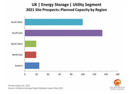 到目前為止,英國所有地區(qū)都已經(jīng)部署了電池儲能系統(tǒng),其中在東南部地區(qū)運(yùn)營的電池儲能系統(tǒng)的總裝機(jī)容量最多,而占到總規(guī)劃容量的比例更大。因此,在2021年的選址前景中,英國東南地區(qū)的儲能部署占據(jù)主導(dǎo)地位也就不足為奇了。