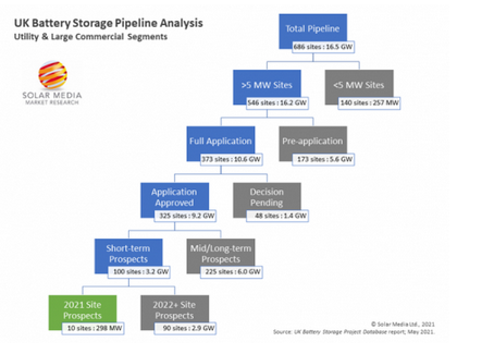 在英國儲能部規(guī)劃中,在10個站點(diǎn)部署的電池儲系統(tǒng)(總共686個站點(diǎn))在2021年開通運(yùn)營的可能性最大,這些儲能系統(tǒng)的總裝機(jī)容量將近300MW。