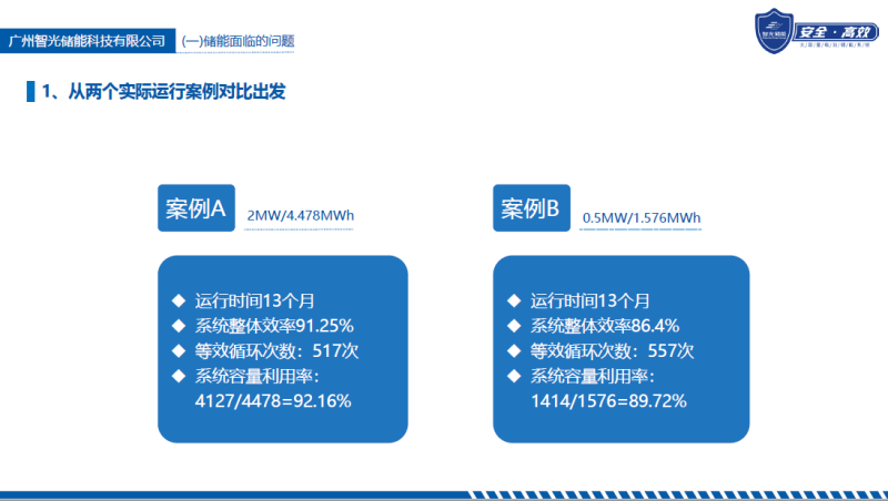 (圖示)這是兩個案例,左邊是高壓級聯(lián)型技術(shù)路線運行的儲能案例,右邊是常規(guī)低壓的儲能案例。在今年3月份,我們對這兩個案例做了一個容量核定實驗,兩個案例的運行時間都是13個月,大家可以看到,系統(tǒng)整體效率,案例A是91.25%,案例B是86.4%,也就是說,在高壓大容量化之后,系統(tǒng)整體的效率確實得到很大的提升。關(guān)于容量利用率的數(shù)據(jù),這反映了整個系統(tǒng)我們要獲得同樣多并網(wǎng)電量的情況下,電池容量利用率較高的儲能技術(shù)方案,電池初始安裝容量是不是可以更降低一些?從這兩個案例對比可以看出:在獲得同等并網(wǎng)電量的條件下,不同技術(shù)路線的儲能系統(tǒng),其效率、電池安裝容量、壽命等都有差異,那么其全生命周期過程中總成本肯定也存在較大的差異。