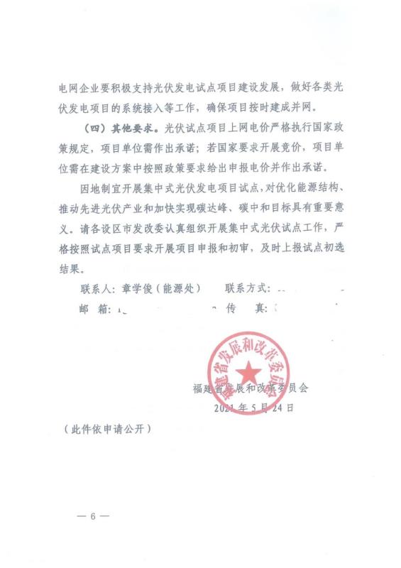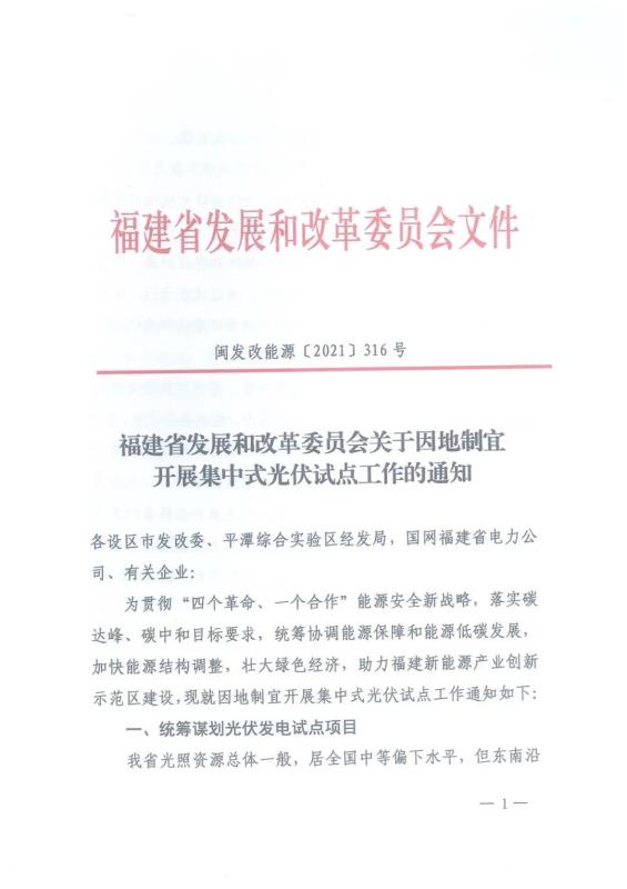 5月24日,福建省發(fā)改委下發(fā)《關(guān)于因地制宜開(kāi)展集中式光伏試點(diǎn)工作的通知》,就集中式光伏電站試點(diǎn)項(xiàng)目的申報(bào)提出指導(dǎo)意見(jiàn)。
