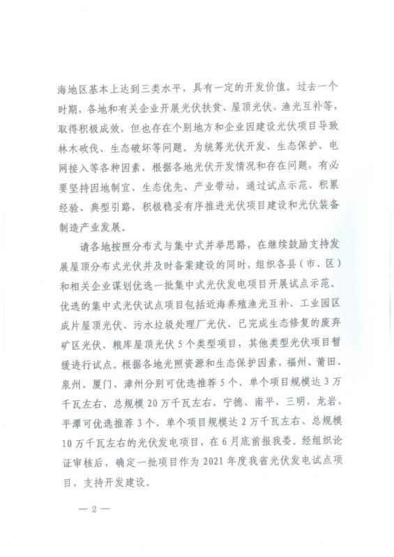 根據(jù)文件,福建省在東南沿海地區(qū)光照資源基本達(dá)到三類(lèi)要求,具有一定開(kāi)發(fā)價(jià)值,為避免因開(kāi)發(fā)光伏項(xiàng)目導(dǎo)致生態(tài)破壞,故通過(guò)本文件優(yōu)先落地一批試點(diǎn)項(xiàng)目,從而規(guī)范引導(dǎo)并推進(jìn)光伏產(chǎn)業(yè)的發(fā)展。