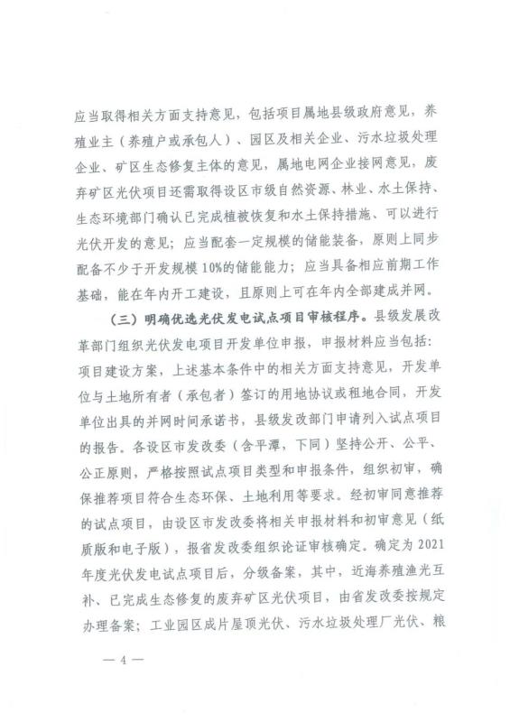在項(xiàng)目?jī)?yōu)選方面,特別強(qiáng)調(diào)不得破壞生態(tài),申報(bào)材料不僅要獲得項(xiàng)目屬地縣級(jí)各政府部門(mén)的相關(guān)審批意見(jiàn),養(yǎng)殖業(yè)主、園區(qū)企業(yè)、污水企業(yè)以及礦區(qū)修復(fù)主體的意見(jiàn)以及用地協(xié)議和租賃合同也包含在內(nèi)。其中,漁光互補(bǔ)、廢棄礦區(qū)光伏項(xiàng)目由省級(jí)發(fā)改委備案辦理,另外三類(lèi)項(xiàng)目由屬地發(fā)改委部門(mén)辦理。