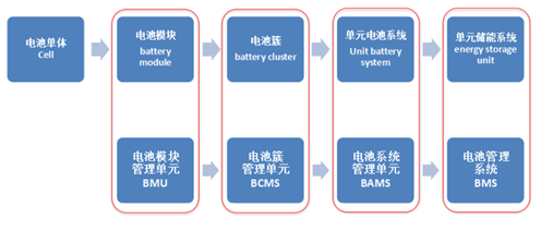 本部分主要按照以鉛酸電池、鋰離子電池、液流電池等電化學(xué)儲(chǔ)能電池的結(jié)構(gòu)方式給出了術(shù)語(yǔ)定義,從儲(chǔ)能系統(tǒng)的構(gòu)成上從小到大包括電池單體、電池模塊、電池簇、單元電池系統(tǒng)、單元儲(chǔ)能系統(tǒng),與之對(duì)應(yīng)的管理系統(tǒng)分別是電池模塊管理單元、電池簇管理單元、電池系統(tǒng)管理單元、電池管理系統(tǒng)。標(biāo)準(zhǔn)中后續(xù)對(duì)儲(chǔ)能系統(tǒng)的標(biāo)識(shí)編碼也是按上述層級(jí)展開(kāi)的。