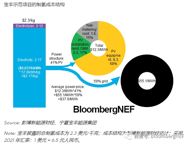 寶豐計劃成立一家專注于綠色制氫的子公司。未來寶豐將提高光伏和電解槽之間的容量比,最終實(shí)現(xiàn)完全“綠色”制氫。寶豐預(yù)計其未來的綠氫生產(chǎn)成本會降至每千克1.2美元,基于一個重要的假設(shè):將電網(wǎng)當(dāng)作一個虛擬儲能電池來為光伏發(fā)出的電做存儲和釋放的成本為每兆瓦時15.4美元。彭博新能源財經(jīng)認(rèn)為,這個假設(shè)長期看來過于樂觀,寶豐的預(yù)期綠氫成本有可能被低估。