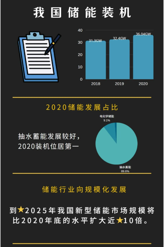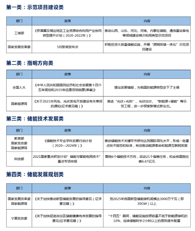 2021年4月21日,國家發(fā)革委和國家能源局聯(lián)合發(fā)布了《關(guān)于加快推動新型儲能發(fā)展的指導(dǎo)意見(征求意見稿)》。其中提出“到2025年,實現(xiàn)新型儲能從商業(yè)化初期向規(guī)模化發(fā)展轉(zhuǎn)變,新型儲能裝機規(guī)模達 3000 萬千瓦以上;到2030年,實現(xiàn)新型儲能全面市場化發(fā)展”的主要目標。”