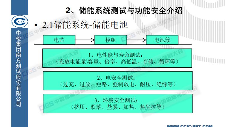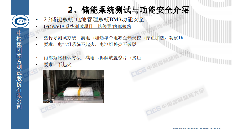 2.安全項(xiàng)目。因?yàn)檎麄€儲能工作環(huán)境比較穩(wěn)定,它沒有振動沖擊的項(xiàng)目,包括沒有一些運(yùn)輸測試項(xiàng)目。它也是分電芯、模組和電池簇三部分,電芯的主要項(xiàng)目是絕熱溫升,溫升速率也是很緩慢,0.5℃/min。如果其他類別的電池,可能至少是5℃/min的溫升速率做循環(huán)。過充、過放、短路、擠壓(13KN,區(qū)別于動力電池最低200KN),包括電芯、模組的擠壓都是用13KN。如果是動力電池的模組,就是根據(jù)串聯(lián)的級數(shù),擠壓力值要乘以串聯(lián)級數(shù)。包括模組,模組和電池簇里面有一些電安全項(xiàng)目,就是絕緣、耐壓和鹽霧、高溫高濕、熱失控,熱失控與電芯熱失控測試方法類似。因?yàn)榭紤]到模組里面的評判要求。簡單地說,擠壓、熱失控、過充、過放,基本的測試方法與其他類別的電池是一樣的,只是它的具體測試參數(shù)不同。