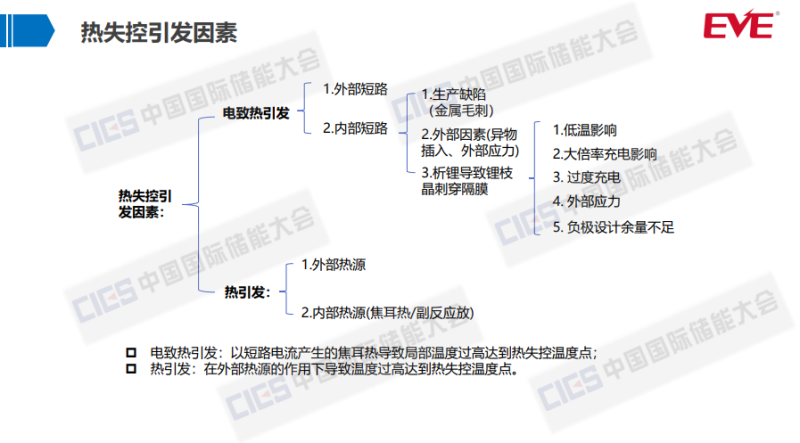 因為很多安全事故最終表現(xiàn)出來的就是會冒煙、起火或者爆炸,在此之前它更多是從熱失控轉變到最終的結果,熱失控可能會有一系列的引發(fā)因素:像電致熱引發(fā),有外部短路、內部短路。內部短路分為生產缺陷導致的一些毛刺或者粉塵,導致內部短路;外部因素,目前很多的針刺以及擠壓等等,可以會導致短路。還有電池本身在整個循環(huán)過程中濫用熱可能會析鋰導致串刺隔膜,導致短路。析鋰主要是由像低溫充放電、過充以等原因導致。熱引發(fā)也是目前熱蔓延測試的方法,就是通過加熱來導致電池內部的隔膜減縮、熔化,而導致內部短路進一步引發(fā)熱失控。這是熱失控最終導致起火的大概因素,我們可以從這些因素和過程來看產品在設計和使用過程中可以采取哪些措施。