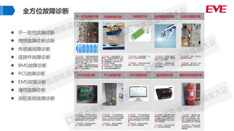 從整個系統(tǒng)的故障診斷來說,我們會把整個系統(tǒng)所有關鍵的點納入到整個監(jiān)控范圍內,像不一致性故障診斷、絕緣故障、傳感器故障、連接件的故障,我們之前碰到過連接件的故障,它主要是在正極、負極或者關鍵連接點出現(xiàn)過熱,這一塊我們都會布相關的采溫點,能夠把風險點及時識別到,還有包括BMS故障,包括本身硬件及通訊故障等等,我們都會相應故障診斷功能。