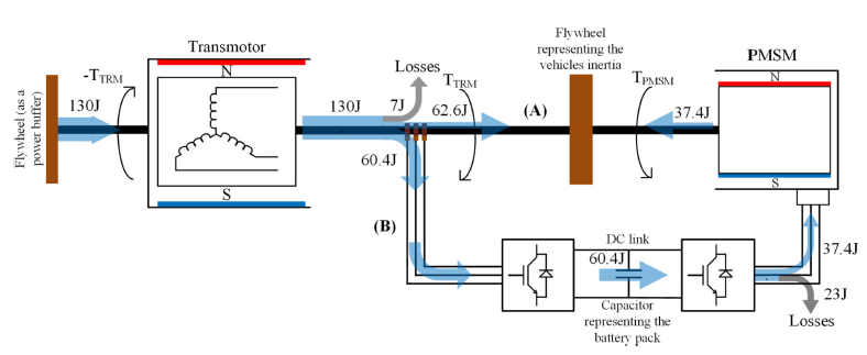 技術突破:提出了一種基于飛輪動能回收系統(tǒng)的新型全輪驅動電動動力系統(tǒng),實例分析表明,與傳統(tǒng)的基于永磁同步電機的動力系統(tǒng)相比,該系統(tǒng)在加速/減速過程中將電化學存儲量降至零,可以提高動力系統(tǒng)的效率和電池壽命。
