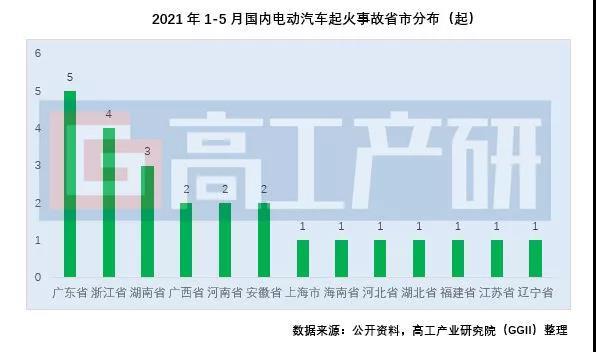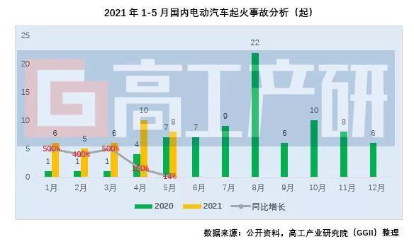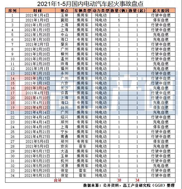 高工產(chǎn)業(yè)研究院(GGII)根據(jù)公告資料不完全統(tǒng)計(jì),2021年1-5月國內(nèi)共發(fā)生電動(dòng)汽車起火事故34起,較去年同期增加20起;涉及車輛數(shù)目38輛,較去年同期增長73%,隨著國內(nèi)電動(dòng)汽車保有量的快速增長,起火事故備受業(yè)內(nèi)關(guān)注。
