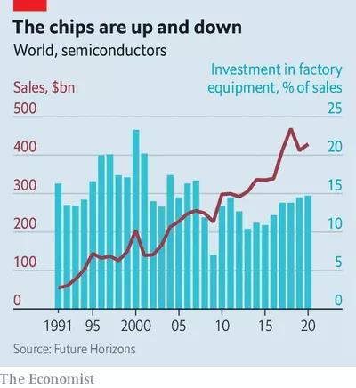 芯片行業(yè)咨詢公司Future Horizons的負(fù)責(zé)人馬爾科姆·佩恩(Malcolm Penn)說:“最重要的(要認(rèn)識(shí)到的)一點(diǎn)是,短缺是這個(gè)行業(yè)的一個(gè)自然現(xiàn)象?!彼f,芯片制造是經(jīng)濟(jì)學(xué)家所說的“豬肉周期”經(jīng)濟(jì)的一個(gè)很好的例子,以20世紀(jì)20年代美國(guó)豬肉市場(chǎng)首次分析的供應(yīng)不足和供應(yīng)過剩之間的規(guī)律性波動(dòng)命名。與生豬一樣,芯片的供應(yīng)不能對(duì)需求的變化迅速做出反應(yīng)。佩恩表示,甚至在疫情大流行之前,芯片產(chǎn)能就很緊張。芯片制造商在工廠設(shè)備方面的投資多年來一直低于長(zhǎng)期平均水平(見圖表)。