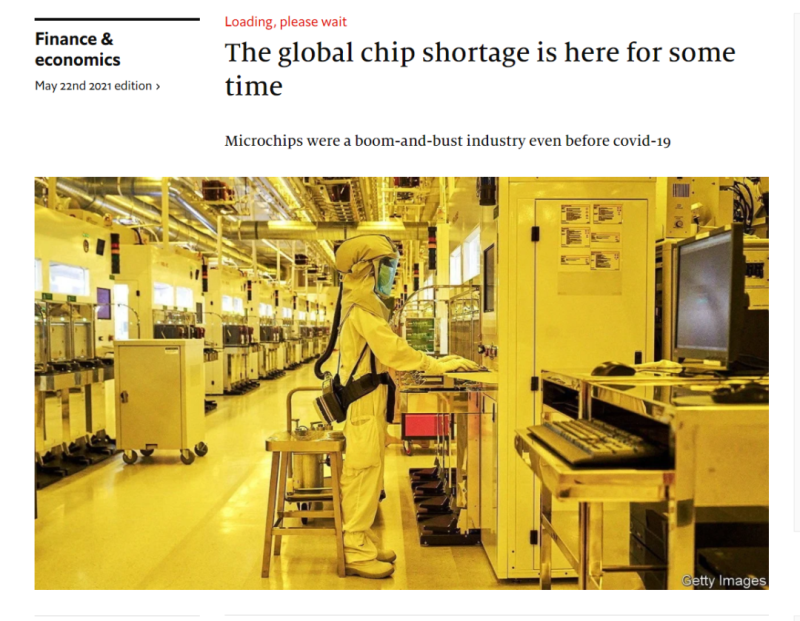 《經(jīng)濟(jì)學(xué)人》雜志發(fā)表文章,題目是:The global chip shortage is here for some time(全球芯片短缺將會(huì)持續(xù)一段時(shí)間)。