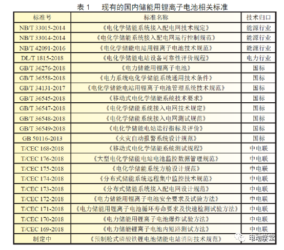 2014年對口IEC/TC120的全國電力儲能標(biāo)準(zhǔn)化技術(shù)委員會(SAC/TC550)成立,負(fù)責(zé)電力儲能領(lǐng)域標(biāo)準(zhǔn)化體系的建立及相關(guān)標(biāo)準(zhǔn)的制定工作。國內(nèi)鋰電儲能相關(guān)標(biāo)準(zhǔn)見表1。