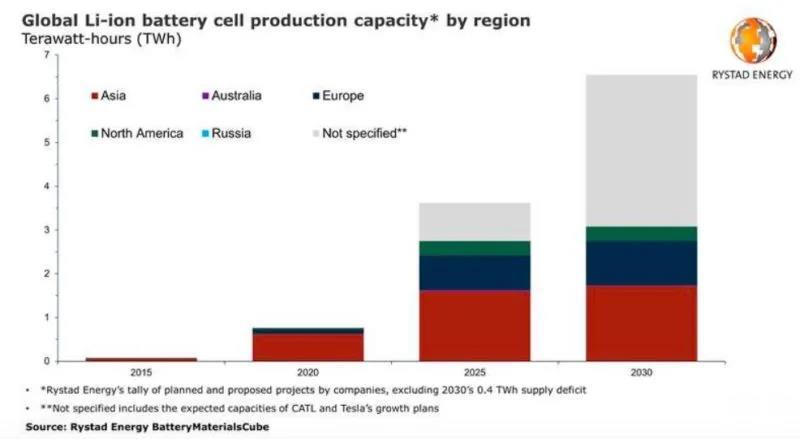 特斯拉目前的總產(chǎn)能只有50GWh,所以3TWh的目標是其當前產(chǎn)能的60倍之巨。根據(jù)特斯拉現(xiàn)有生產(chǎn)設(shè)施,部分新增產(chǎn)能預(yù)計將來自其位于內(nèi)華達州的旗艦工廠。該工廠目前年產(chǎn)能為20GWh,但目前的運營水平僅為其最終產(chǎn)能的30%。然而,即使該廠滿負荷運轉(zhuǎn),也無法實現(xiàn)3TWh這一目標。特斯拉還在紐約和中國上海擁有超級工廠,并正在德克薩斯州的奧斯汀和德國的柏林建造超級工廠。該公司計劃在世界各地建立更多的超級工廠,日本、韓國、英國和印度等國都是傳聞中的候選基地。下圖中的灰色區(qū)域表示未指定區(qū)域的產(chǎn)能,其中大部分屬于特斯拉,Rystad認為到2030年全球EV產(chǎn)業(yè)將需要這么多的電池生產(chǎn)。然而,從圖中可以看出,大部分現(xiàn)有和承諾中的產(chǎn)能均位于亞洲,但一半以上的新增產(chǎn)能尚未確定生產(chǎn)位置。