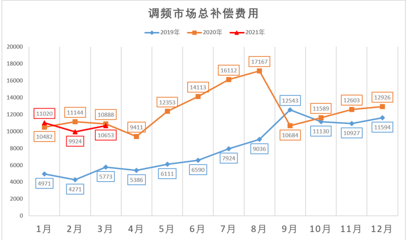 (圖示)再介紹一下廣東調(diào)頻市場的概況。廣東省調(diào)頻市場已經(jīng)運(yùn)行兩年多時(shí)間了,大家可以看到,藍(lán)色的線是2019年,市場開放以后,市場的費(fèi)用是不斷增加的,到19年9月份以后,每個(gè)月都在1億以上。在2020年,基本上每個(gè)月都是穩(wěn)定在1億以上,最高是8月份1.7個(gè)億,隨后,試運(yùn)行政策調(diào)整了,之后降低了一些,但由于市場需求,后面繼續(xù)回升。紅色的線是2020年前三個(gè)月的,也維持在1億以上的水平,隨著未來負(fù)荷的增加,整個(gè)服務(wù)費(fèi)用會(huì)繼續(xù)增加。