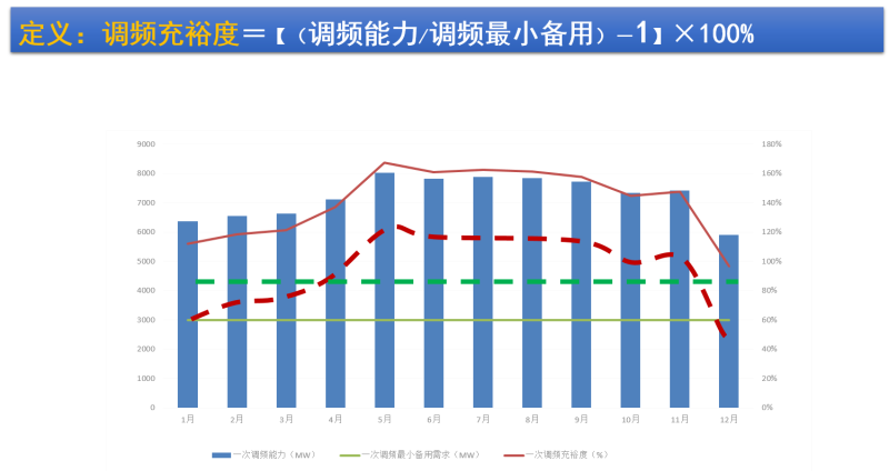 (圖示)對(duì)于整個(gè)電網(wǎng)來說,我們希望我們?cè)陔娏ο到y(tǒng)的各個(gè)環(huán)節(jié)都有很多的充裕度,比如說調(diào)頻,假設(shè)我們定義調(diào)頻充裕度=[(調(diào)頻能力/調(diào)頻最小備用)-1]X100%,這條綠色的線就是整個(gè)系統(tǒng)對(duì)調(diào)頻的基本需求曲線,這條紅線是充裕度。隨著我的能源結(jié)構(gòu)逐漸調(diào)整,充裕度會(huì)越來越小,然后但需求會(huì)越來越大,如果這兩個(gè)線交叉的話,電力系統(tǒng)的運(yùn)行將非常不安全,因?yàn)檎麄€(gè)系統(tǒng)已經(jīng)沒有安全余量了。