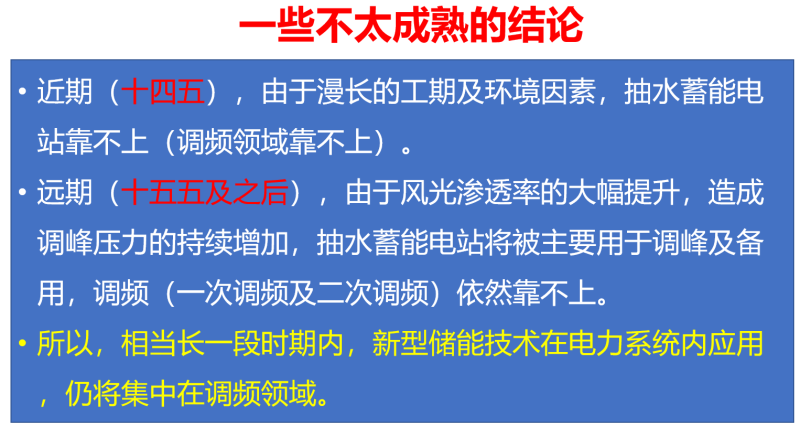 基于此,我形成了一些不太成熟的結(jié)論:第一,我認(rèn)為在“十四五”期間,由于漫長的工期以及環(huán)境因素,抽水蓄能電站靠不上,這里主要指的是電網(wǎng)調(diào)頻領(lǐng)域靠不上抽蓄。第二,“十五五”以后,由于風(fēng)光滲透率的大幅提升,造成調(diào)峰壓力的持續(xù)增加,抽水蓄能電站將主要用于調(diào)峰以及備用,在電網(wǎng)調(diào)頻依然靠不上。所以,我的結(jié)論很簡單,在未來十年以內(nèi),新型儲(chǔ)能技術(shù)將在電力系統(tǒng)中得到非常廣泛的應(yīng)用,主要的應(yīng)用將集中在調(diào)頻領(lǐng)域,這里包括了一次調(diào)頻和二次調(diào)頻。