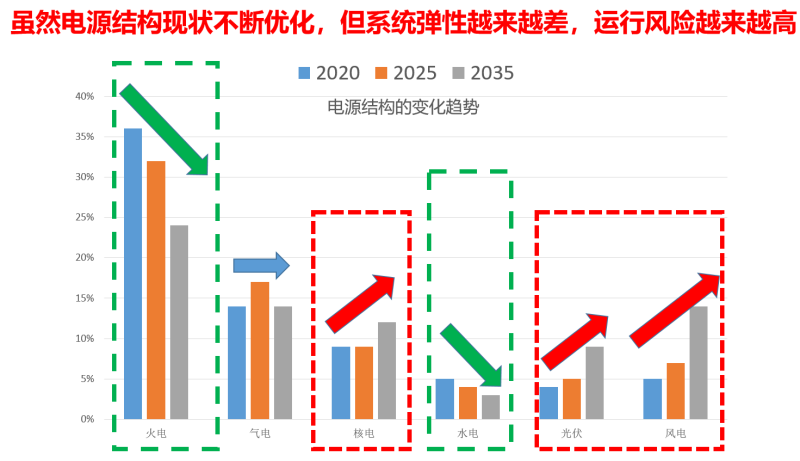 這張圖是我們之前針對(duì)廣東省的電源結(jié)構(gòu),做的低碳轉(zhuǎn)型做的規(guī)劃,我們做這個(gè)規(guī)劃的時(shí)候,國家還沒有提出碳中和的目標(biāo)。若想從高碳向低碳轉(zhuǎn)型,到2035年,煤電將降低到24%,氣電比例保持不變,但是氣電的總裝機(jī)容量是上升的。水電和太陽能加起來要達(dá)到23%,水電的裝機(jī)占比稍微降低,廣東省內(nèi)的水電資源已經(jīng)完全開發(fā)完畢,抽水蓄能還能再建一些。在這樣的形勢下,對(duì)整個(gè)系統(tǒng)來說,靈活性資源是不足的。雖然電源結(jié)構(gòu)不斷優(yōu)化、更加清潔化、低碳化,風(fēng)電和光伏的發(fā)電占比越來越高,但是,整個(gè)電力系統(tǒng)的彈性越來越差,運(yùn)行風(fēng)險(xiǎn)越來越高。
