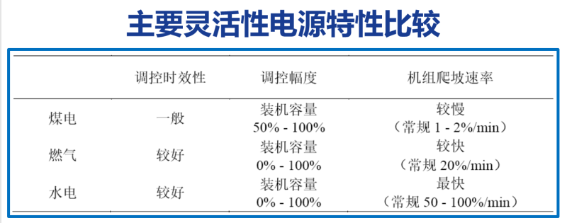 追求“雙碳”的目標(biāo),建設(shè)一個(gè)以新能源為主體的新型電力系統(tǒng),需要我們的電力系統(tǒng)里配置大量的靈活性資源。煤電的靈活性比較好,排名第三,它的機(jī)組爬坡率大概是1%-2%;水電最好,機(jī)組爬坡率高達(dá)50%,是目前最好的靈活性資源。