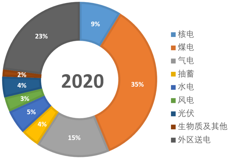 我們做儲(chǔ)能項(xiàng)目和做其他任何事情一樣,測算一個(gè)行業(yè)的發(fā)展?jié)摿桶l(fā)展前景的時(shí)候,要看看它的基本盤如何。做儲(chǔ)能項(xiàng)目的基本盤是什么呢?我認(rèn)為是本省的電源結(jié)構(gòu),因?yàn)殡娫唇Y(jié)構(gòu)決定了現(xiàn)在及未來的電力系統(tǒng)對(duì)儲(chǔ)能容量的需求。圖中展示了廣東省2019年以及2020年的電源結(jié)構(gòu)??梢钥吹?,排名第一的是火電,2019年占比36%,2020年占比35%;第二大電源是西電,主要是來自云南、貴州的水電。第三是燃?xì)獍l(fā)電,第四是核電。其中燃?xì)獍l(fā)電裝機(jī)量的占比,在廣東的整個(gè)電源結(jié)構(gòu)里是比較高的。