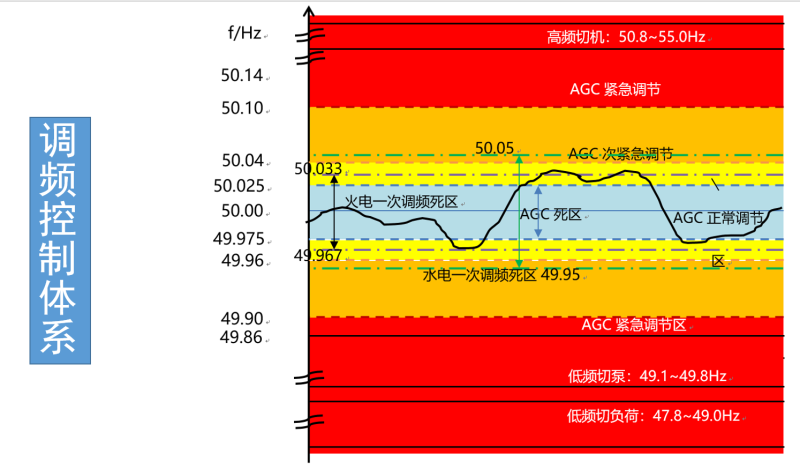(圖示)這是目前的調(diào)頻控制體系,正負(fù)0.025赫茲之內(nèi)是AGC死區(qū),這個(gè)區(qū)域也就意味著二次調(diào)頻的不動(dòng)作,正負(fù)0.035赫茲是一次調(diào)頻死區(qū),這個(gè)區(qū)間火電機(jī)組的一次調(diào)頻功能不動(dòng)作。接著,依次是AGC的正常調(diào)節(jié),次調(diào)節(jié),再往后就是電網(wǎng)事故了。比如,若電網(wǎng)的頻率低于40.8赫茲,這個(gè)時(shí)候的保護(hù)策略就是低頻切泵,低頻切泵,就是關(guān)掉抽水蓄能電站的抽水泵,其實(shí)也是切負(fù)荷的一種方式。抽水蓄能電站在電網(wǎng)里既可以充當(dāng)電源,也可以充當(dāng)負(fù)荷,當(dāng)它抽水的時(shí)候,就是電網(wǎng)的負(fù)荷,在緊急的時(shí)刻,把它切掉也有助于整個(gè)電網(wǎng)系統(tǒng)和頻率的平衡。如果切泵動(dòng)作完成之后,頻率還沒有回歸正常,那就要切負(fù)荷,切負(fù)荷的結(jié)果,就是停電,電力系統(tǒng)也瀕臨崩潰。我們近期看到像英國、臺(tái)灣地區(qū)的大停電,都是因?yàn)橥蝗皇ゴ罅侩娫?,?dǎo)致系統(tǒng)層面必須切負(fù)荷,從而導(dǎo)致的大停電事故。