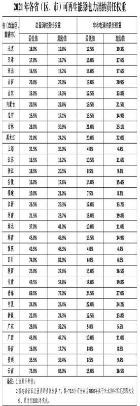 根據(jù)《通知》,從2021年起,每年初滾動發(fā)布各省權(quán)重,同時印發(fā)當年和次年消納責任權(quán)重,當年權(quán)重為約束性指標,各省按此進行考核評估,次年權(quán)重為預(yù)期性指標,各省按此開展項目儲備。