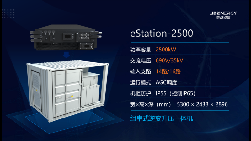這是eStation-2500。額定功率2500KW,它內置了多路的組串式PCS-2000產品,實現(xiàn)了電池簇的多支路接入,單電池簇精細化管理,可以與現(xiàn)有的集裝箱的直流控制系統(tǒng)進行完美的適配。