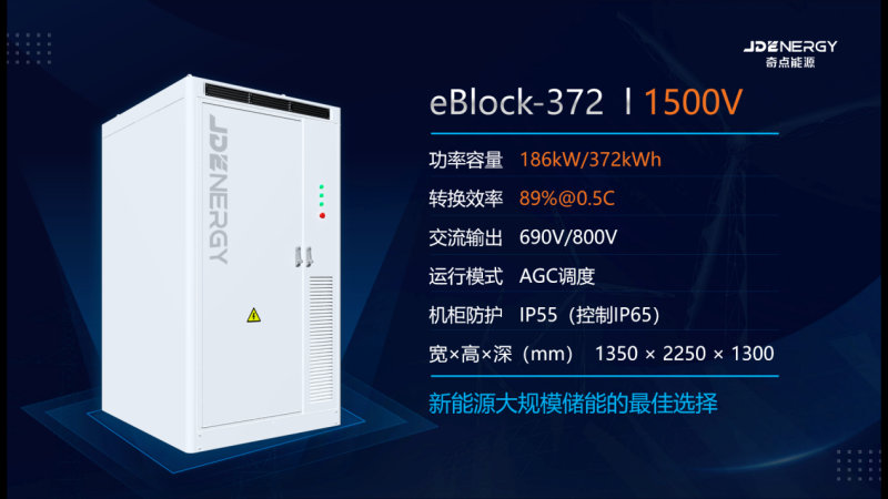 這是eBlock-372,功率容量186KW/372KWh,交流輸出690V,這款產品適用于新能源側和電網(wǎng)側的大規(guī)模儲能應用場景。